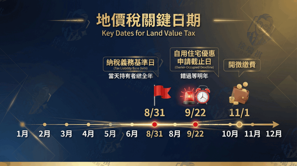 | 納稅基準日 | 8 月 31 日 (當天土地是誰的就誰繳) | 2 月底 |