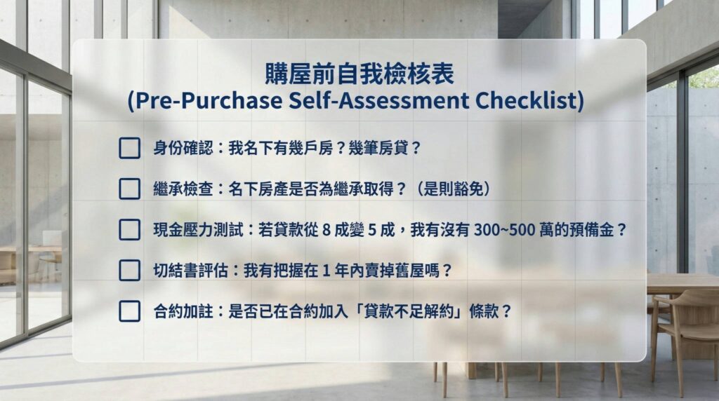 - 策略: 買房簽約前,務必在合約加註「若貸款成數不足或無法核貸,買賣合約自動失效」的解約條款,保護自己。
