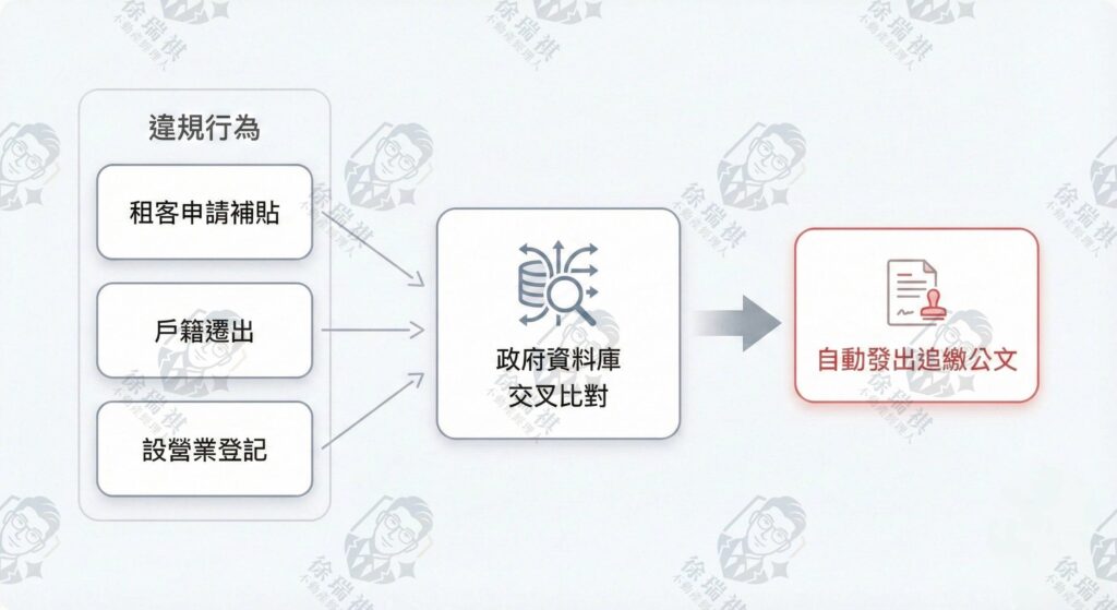 - 跨部會資料庫比對(最致命): 財政部與內政部、社福單位的資料庫已經聯網。如果您的房客申請了「租金補貼」,或者您申請了「營業登記」,系統會自動跳出警示,顯示該地址處於「管制期內」。